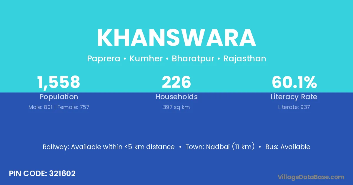 Khanswara village has a total population of 1,558 people, of which 801 are males and 757 are females.