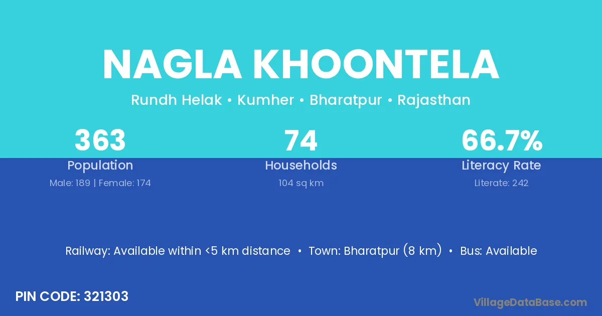 Bharatpur (8 km) is the nearest town to Nagla Khoontela village for major economic activities and is located approximately 8 km away.