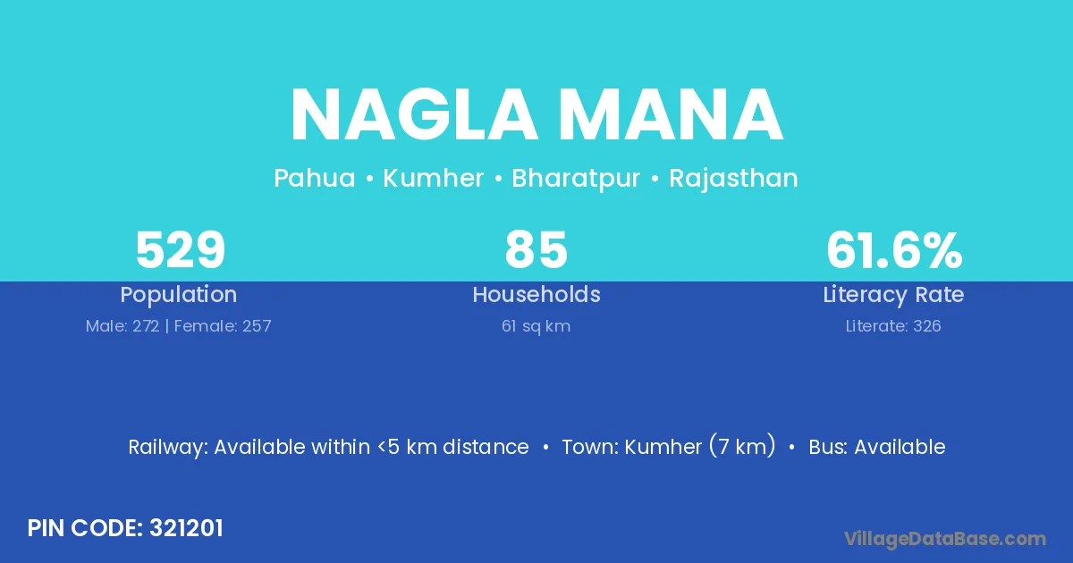 Kumher (7 km) is the nearest town to Nagla Mana village for major economic activities and is located approximately 7 km away.