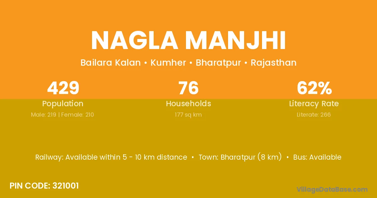 Bharatpur (8 km) is the nearest town to Nagla Manjhi village for major economic activities and is located approximately 8 km away.