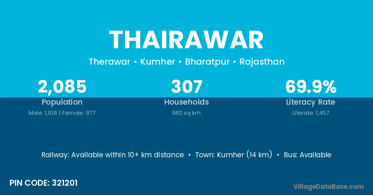 Kumher (14 km) is the nearest town to Thairawar village for major economic activities and is located approximately 14 km away.