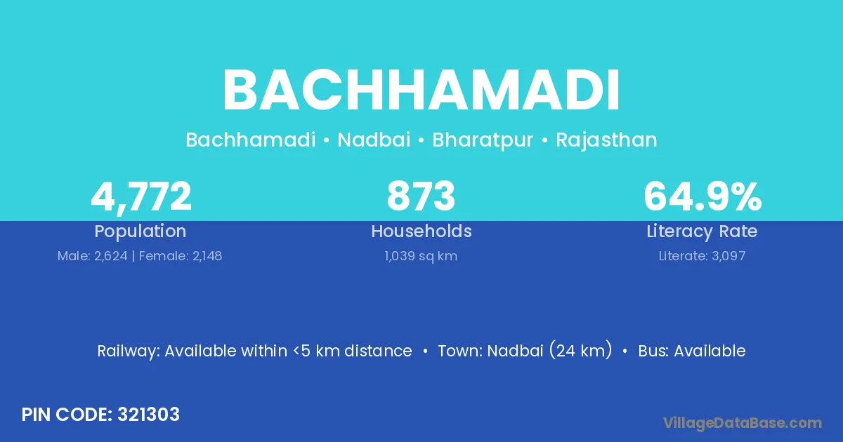 Nadbai (24 km) is the nearest town to Bachhamadi village for major economic activities and is located approximately 24 km away.