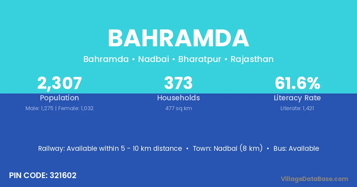Nadbai (8 km) is the nearest town to Bahramda village for major economic activities and is located approximately 8 km away.