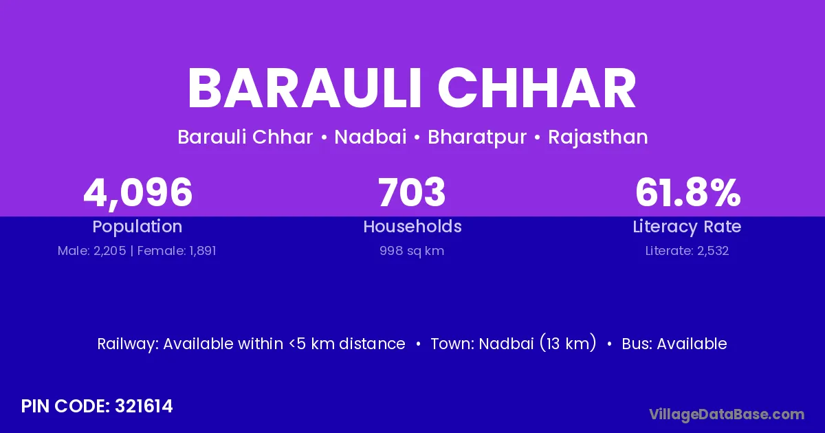 Nadbai (13 km) is the nearest town to Barauli Chhar village for major economic activities and is located approximately 13 km away.