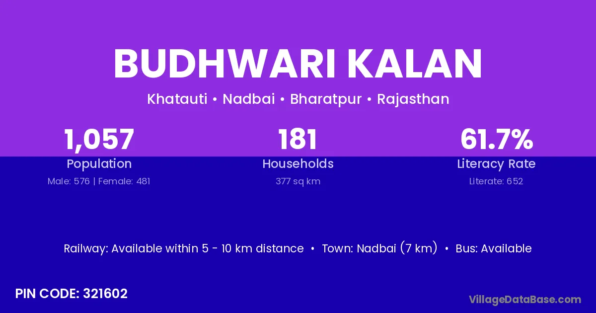 Nadbai (7 km) is the nearest town to Budhwari Kalan village for major economic activities and is located approximately 7 km away.