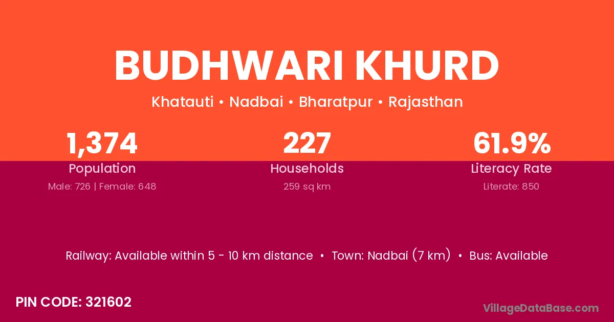Nadbai (7 km) is the nearest town to Budhwari Khurd village for major economic activities and is located approximately 7 km away.