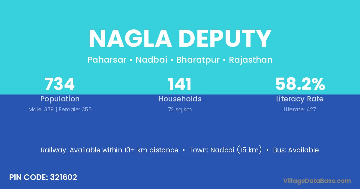 Nadbai (15 km) is the nearest town to Nagla Deputy village for major economic activities and is located approximately 15 km away.