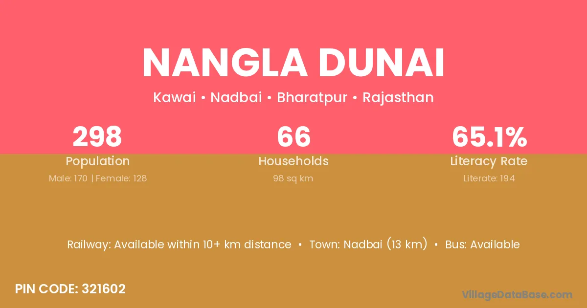 Nadbai (13 km) is the nearest town to Nangla Dunai village for major economic activities and is located approximately 13 km away.