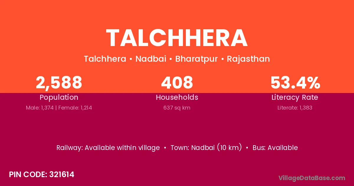 Nadbai (10 km) is the nearest town to Talchhera village for major economic activities and is located approximately 10 km away.