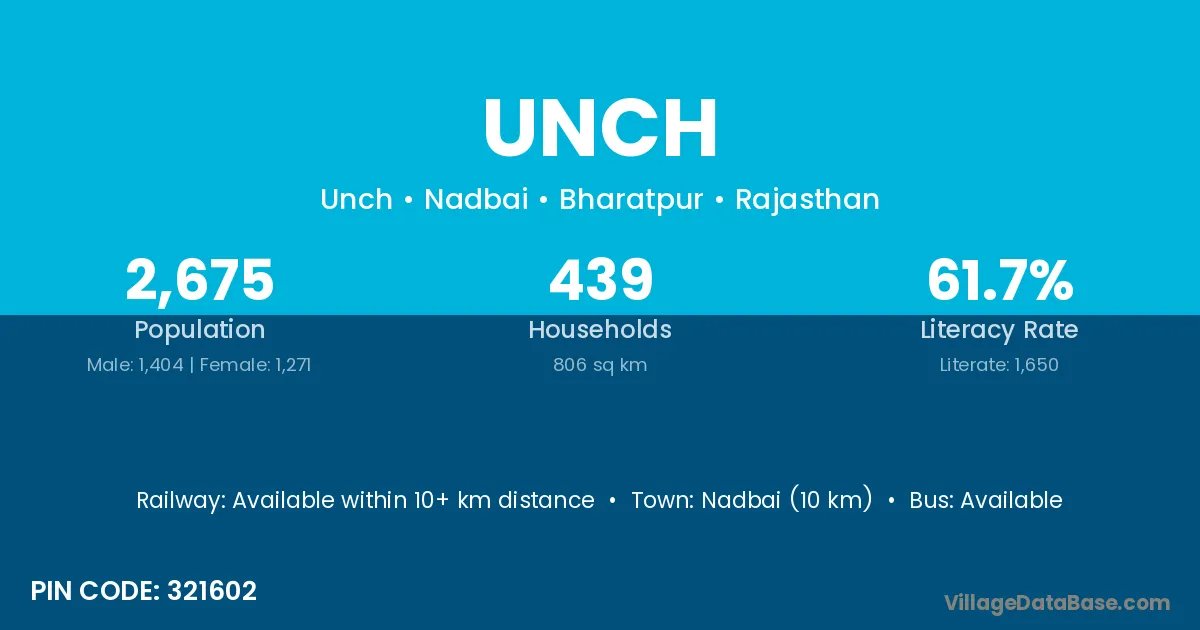 Nadbai (10 km) is the nearest town to Unch village for major economic activities and is located approximately 10 km away.