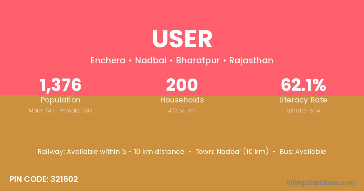 Nadbai (10 km) is the nearest town to User village for major economic activities and is located approximately 10 km away.