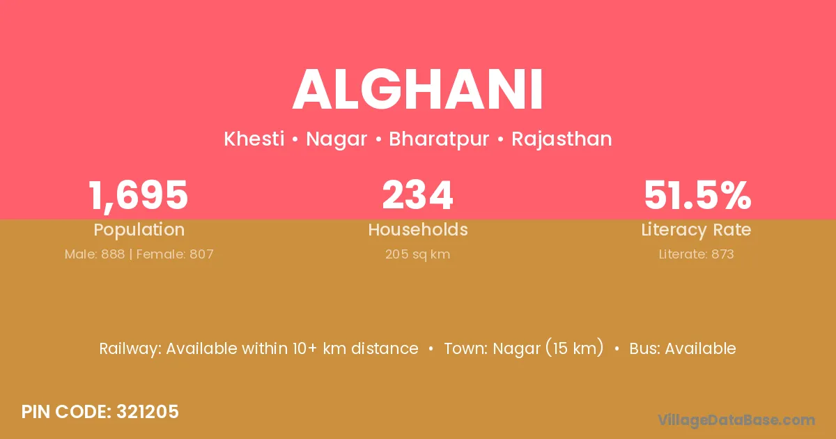 Nagar (15 km) is the nearest town to Alghani village for major economic activities and is located approximately 15 km away.