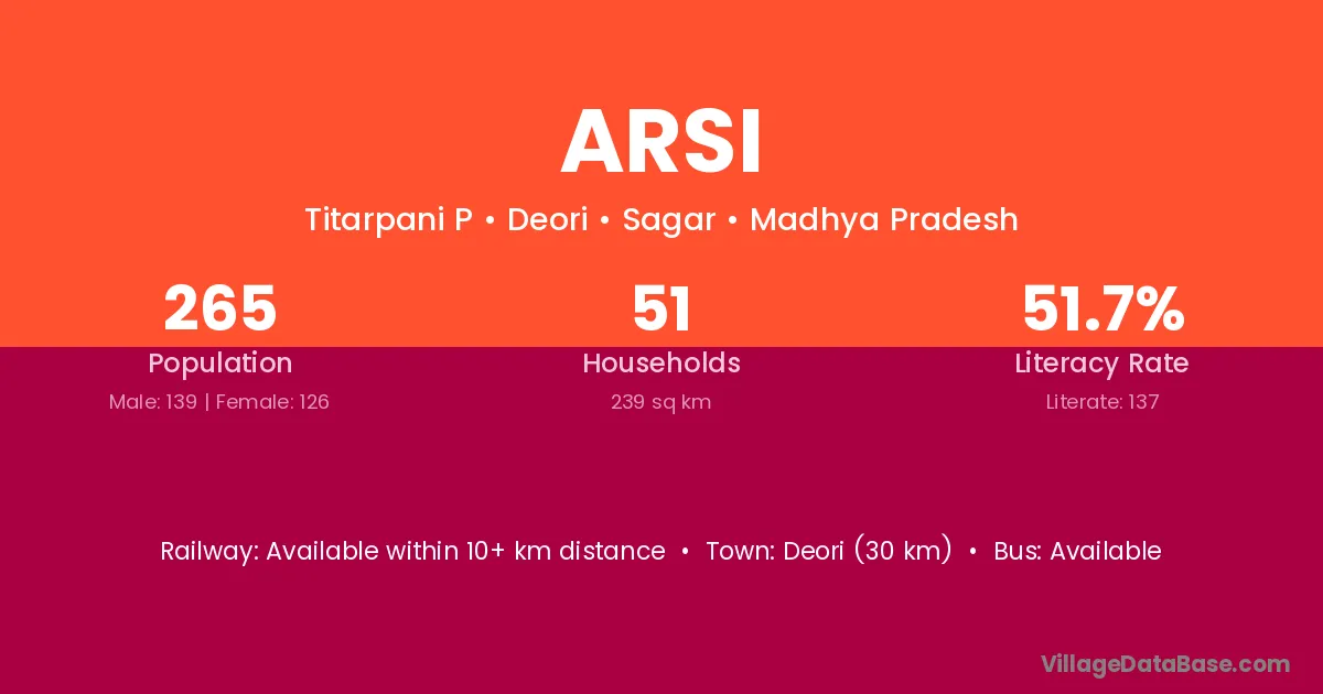 Arsi village has a total population of 1,210 people, of which 660 are males and 550 are females.