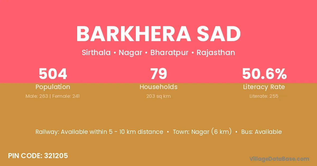 Nagar (6 km) is the nearest town to Barkhera Sad village for major economic activities and is located approximately 6 km away.