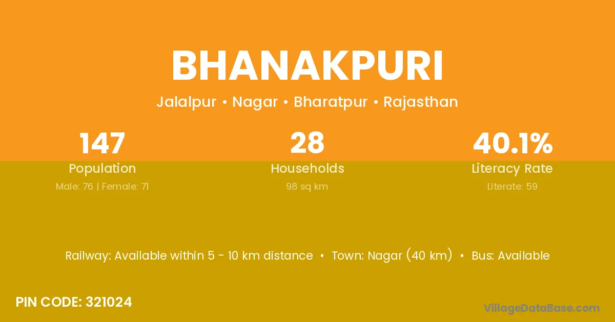 Nagar (40 km) is the nearest town to Bhanakpuri village for major economic activities and is located approximately 40 km away.
