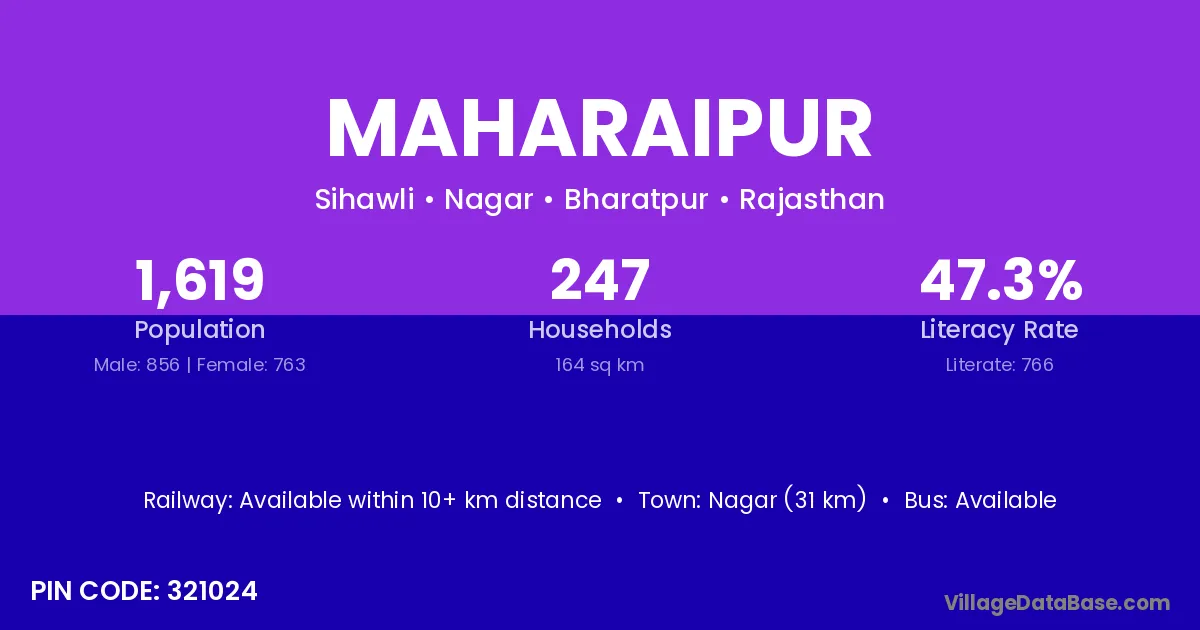 Nagar (31 km) is the nearest town to Maharaipur village for major economic activities and is located approximately 31 km away.