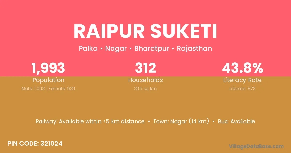 Nagar (14 km) is the nearest town to Raipur Suketi village for major economic activities and is located approximately 14 km away.