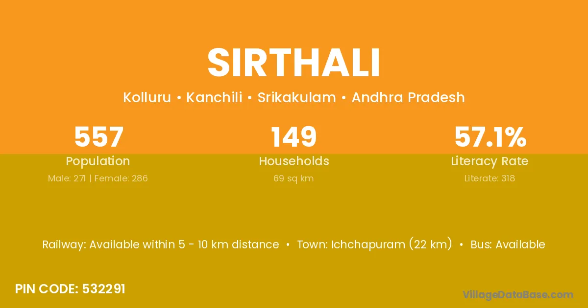 The literacy rate of Sirthali village is 56.63%. Male literacy stands at 69.82% and female literacy at 41.87%.