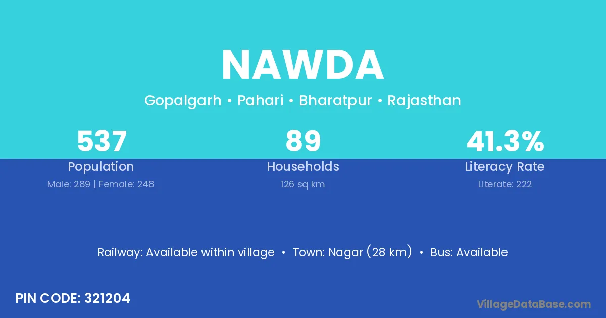 Nagar (28 km) is the nearest town to Nawda village for major economic activities and is located approximately 28 km away.