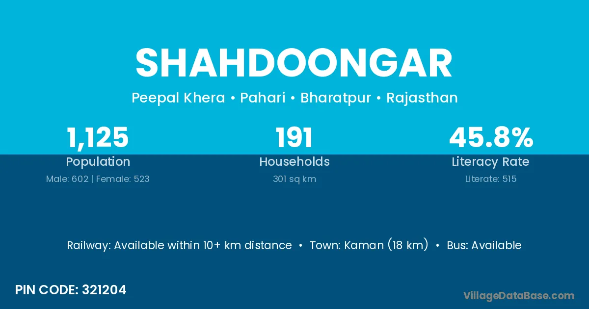 Kaman (18 km) is the nearest town to Shahdoongar village for major economic activities and is located approximately 18 km away.