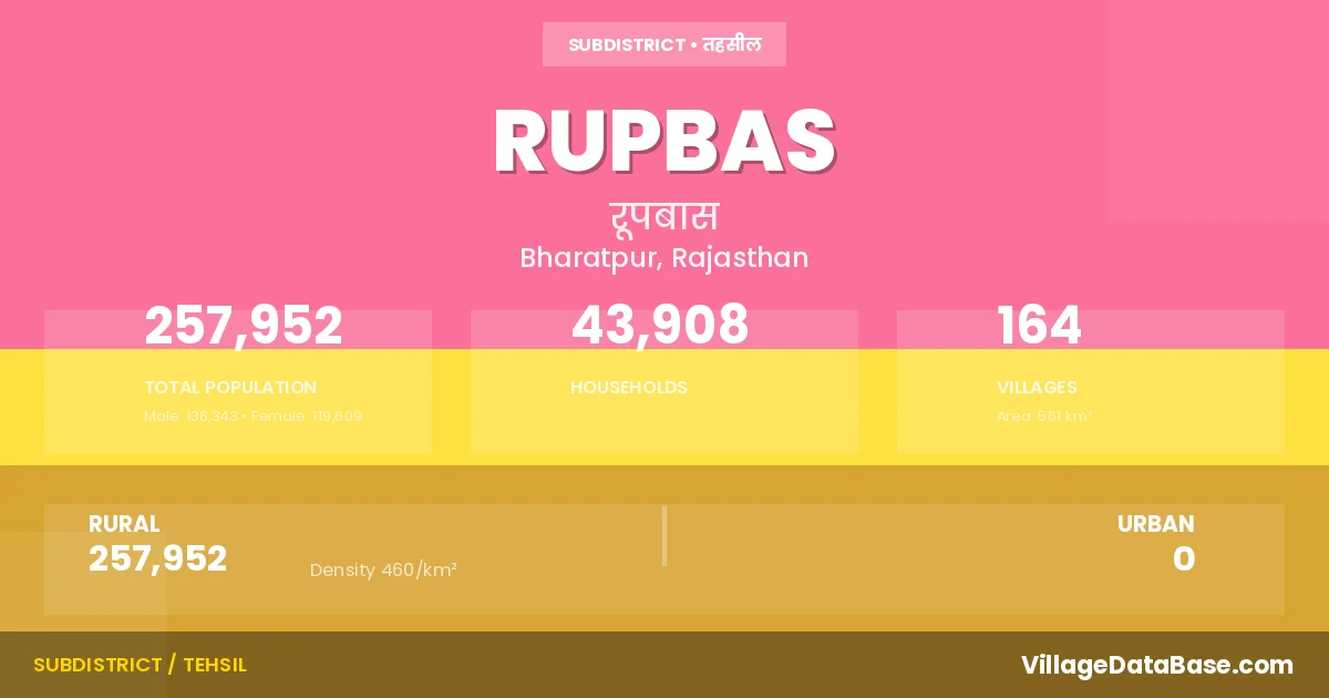 According to the 2011 census The total area of Rupbas Tehsil is 561 km², with a population of 257952 people. The population density is 460 inhabitants per square kilometre, and there are approximately 43908 houses in the sub district.