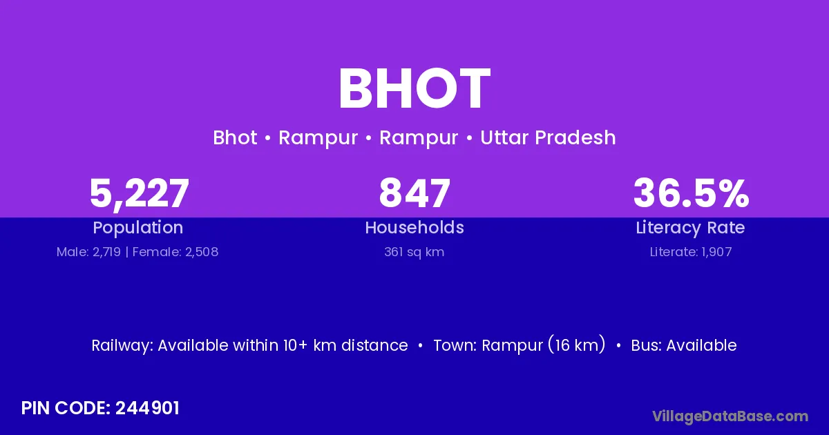 The literacy rate of Bhot village is 67.42%. Male literacy stands at 75.86% and female literacy at 57.20%.