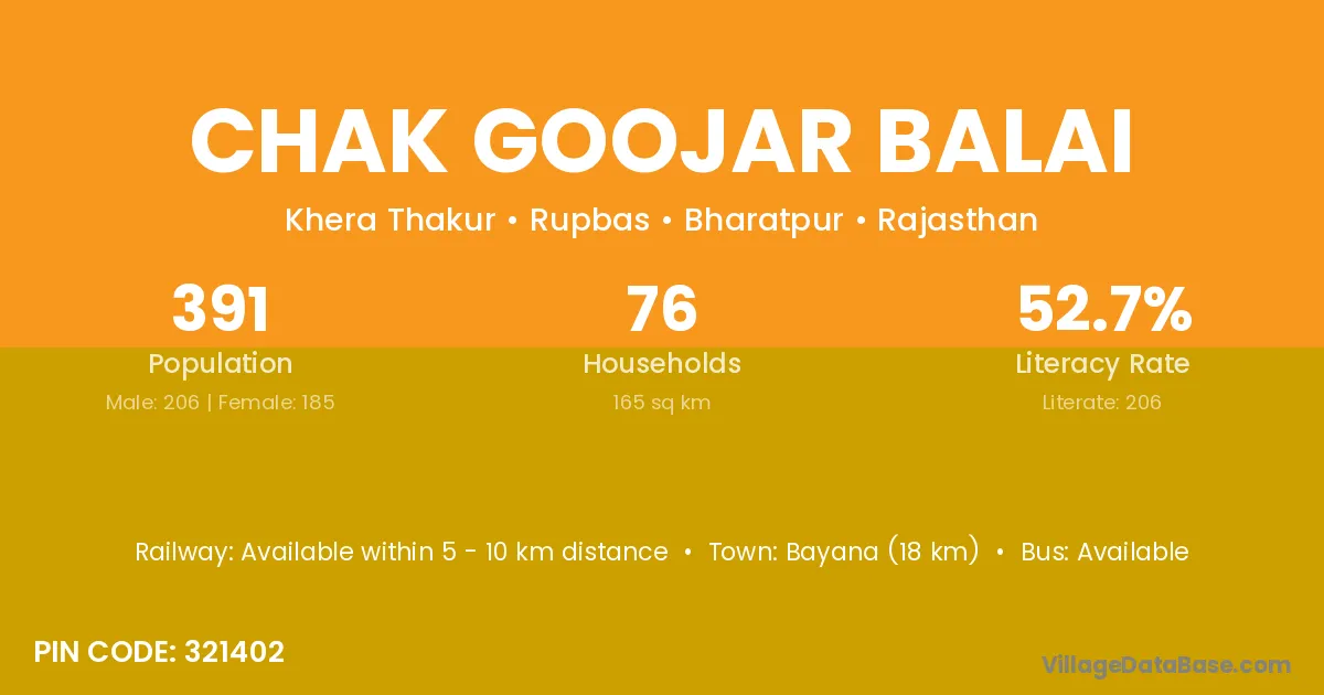 Bayana (18 km) is the nearest town to Chak Goojar Balai village for major economic activities and is located approximately 18 km away.