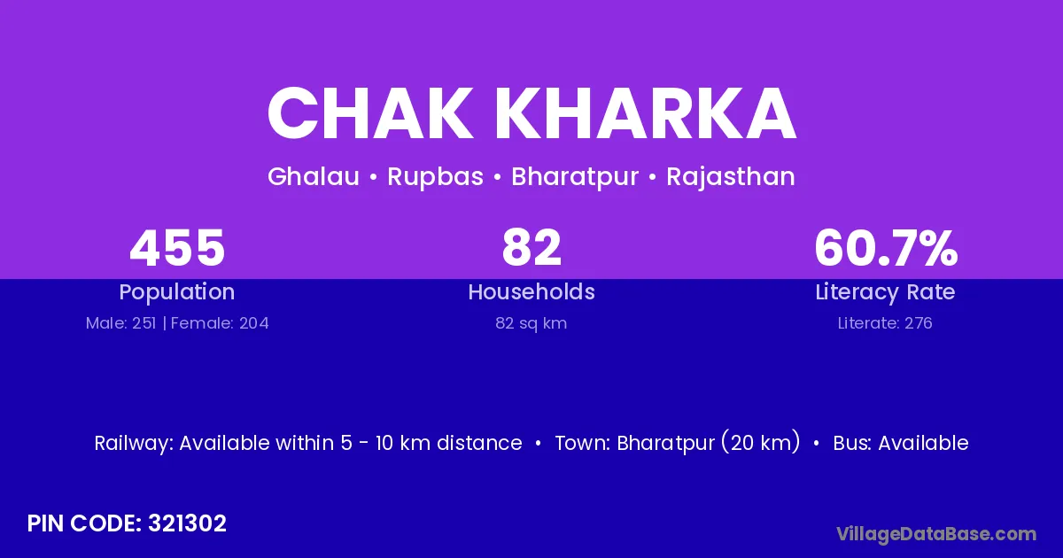 Chak Kharka village has a total population of 455 people, of which 251 are males and 204 are females.