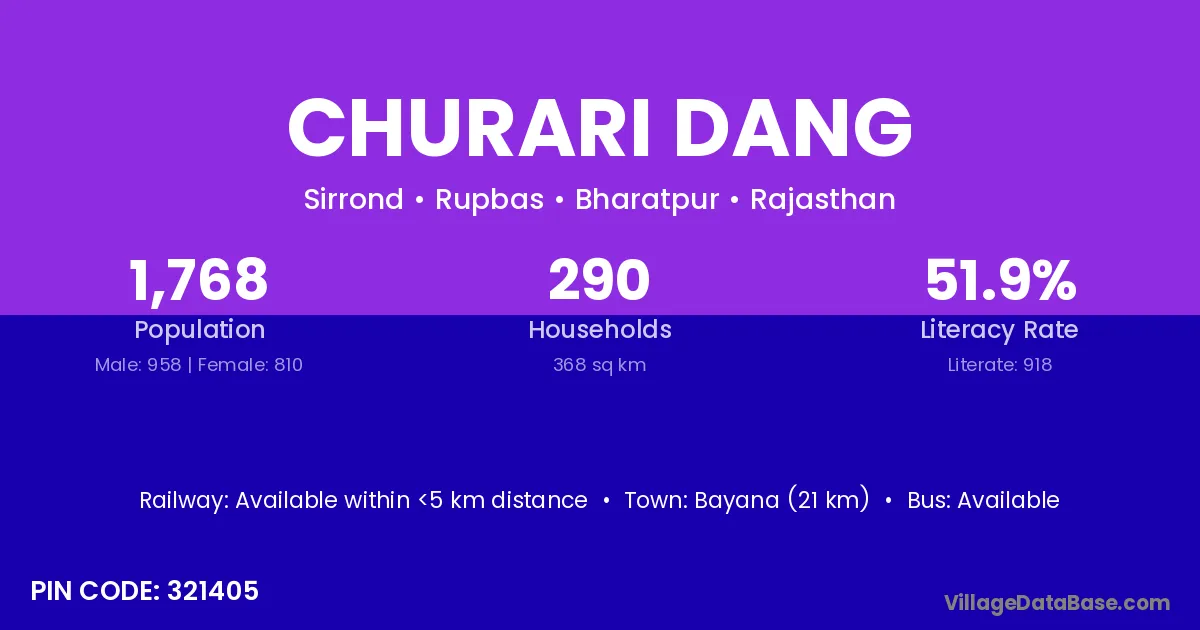 Bayana (21 km) is the nearest town to Churari Dang village for major economic activities and is located approximately 21 km away.