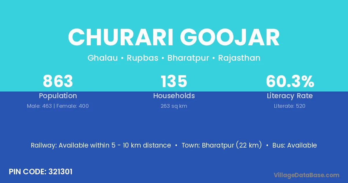 Bharatpur (22 km) is the nearest town to Churari Goojar village for major economic activities and is located approximately 22 km away.