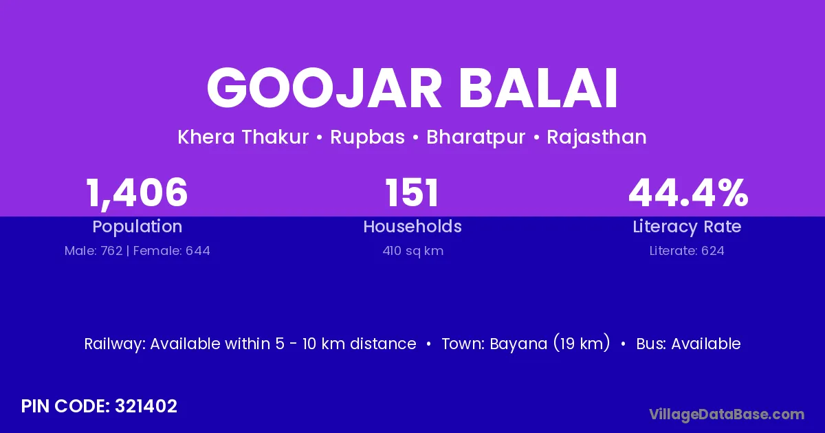 Bayana (19 km) is the nearest town to Goojar Balai village for major economic activities and is located approximately 19 km away.