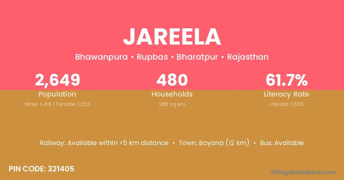 Bayana (12 km) is the nearest town to Jareela village for major economic activities and is located approximately 12 km away.