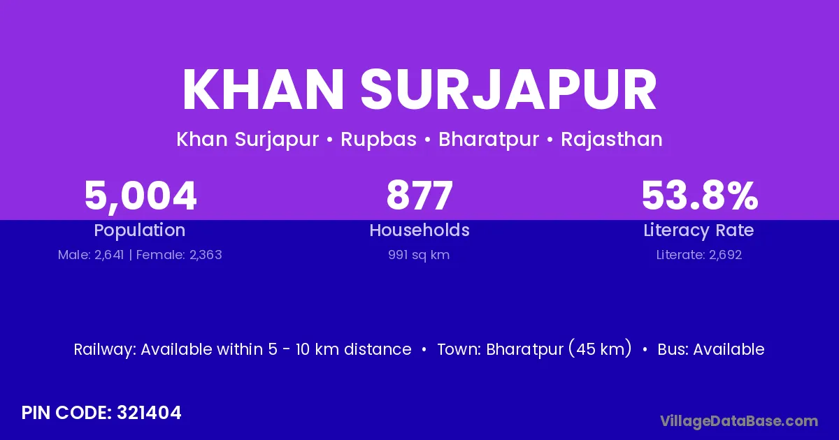 Bharatpur (45 km) is the nearest town to Khan Surjapur village for major economic activities and is located approximately 45 km away.