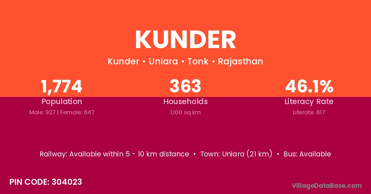 The literacy rate of Kunder village is 58.98%. Male literacy stands at 73.23% and female literacy at 42.58%.