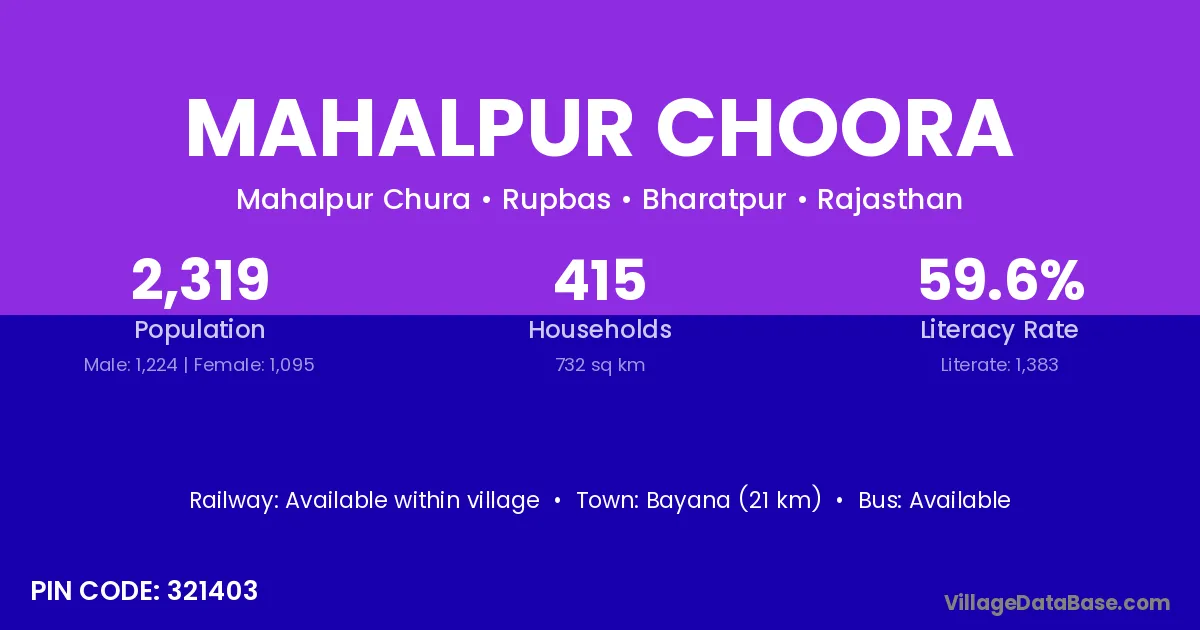 Bayana (21 km) is the nearest town to Mahalpur Choora village for major economic activities and is located approximately 21 km away.