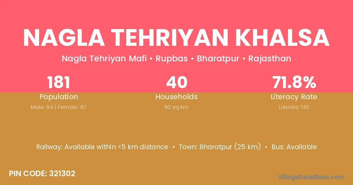 Bharatpur (25 km) is the nearest town to Nagla Tehriyan Khalsa village for major economic activities and is located approximately 25 km away.