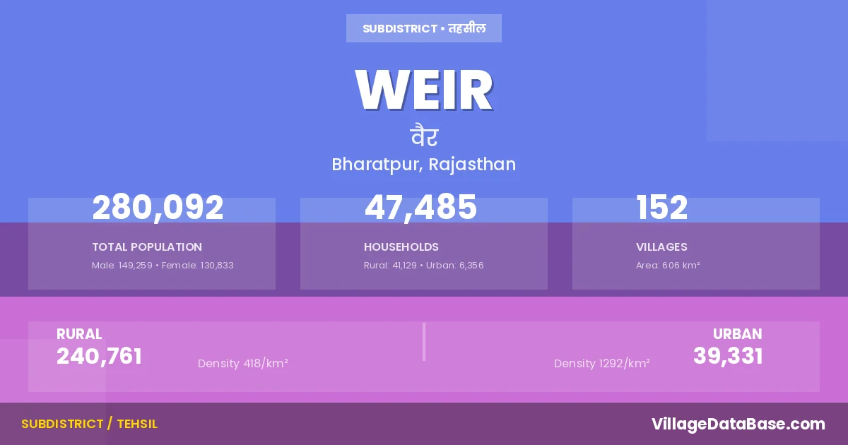 According to the 2011 census The total area of Weir Tehsil is 606 km², with a population of 280092 people. The population density is 462 inhabitants per square kilometre, and there are approximately 47485 houses in the sub district.