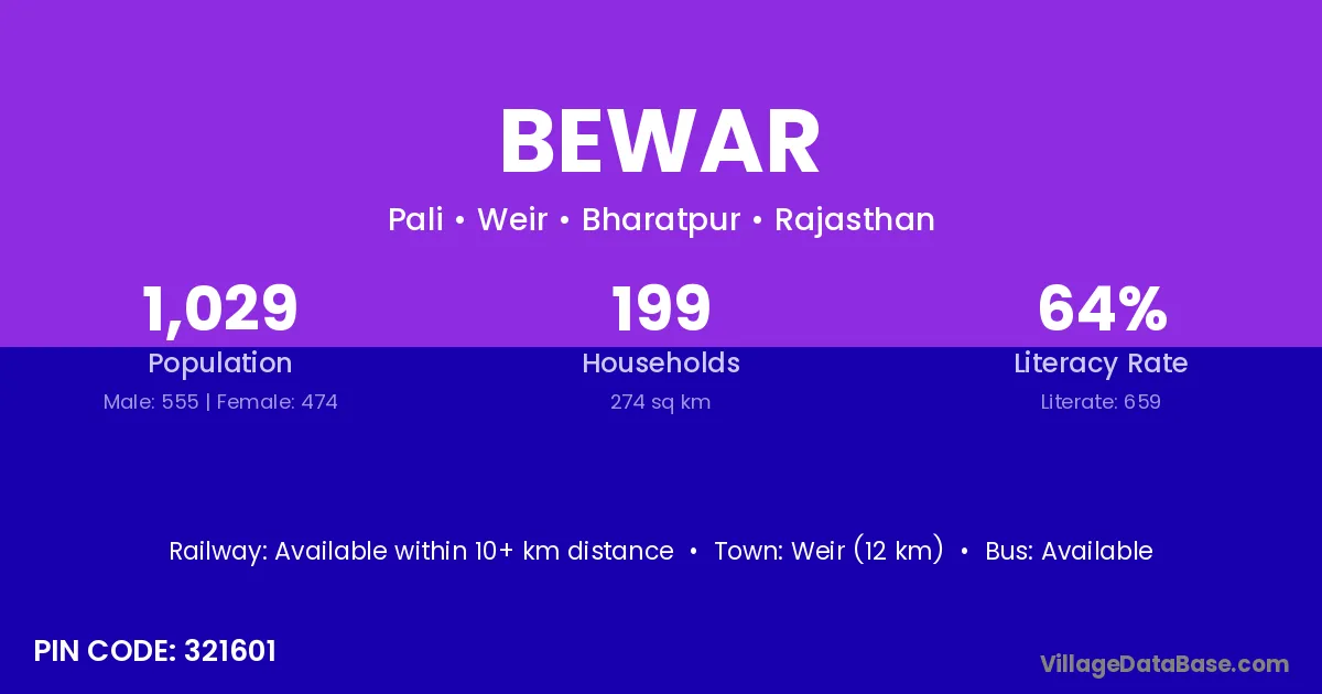 Weir (12 km) is the nearest town to Bewar village for major economic activities and is located approximately 12 km away.
