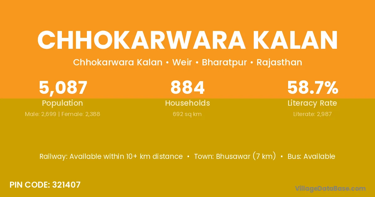 Bhusawar (7 km) is the nearest town to Chhokarwara Kalan village for major economic activities and is located approximately 7 km away.