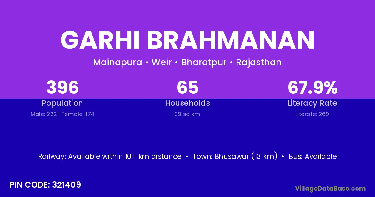 Bhusawar (13 km) is the nearest town to Garhi Brahmanan village for major economic activities and is located approximately 13 km away.