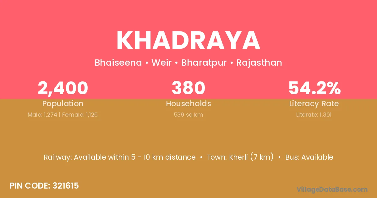 Kherli (7 km) is the nearest town to Khadraya village for major economic activities and is located approximately 7 km away.