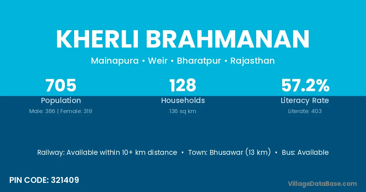 Bhusawar (13 km) is the nearest town to Kherli Brahmanan village for major economic activities and is located approximately 13 km away.