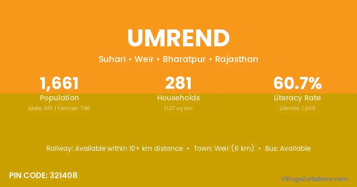 Weir (6 km) is the nearest town to Umrend village for major economic activities and is located approximately 6 km away.