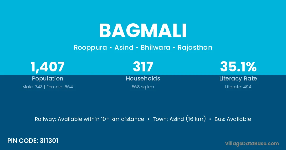 Asind (16 km) is the nearest town to Bagmali village for major economic activities and is located approximately 16 km away.
