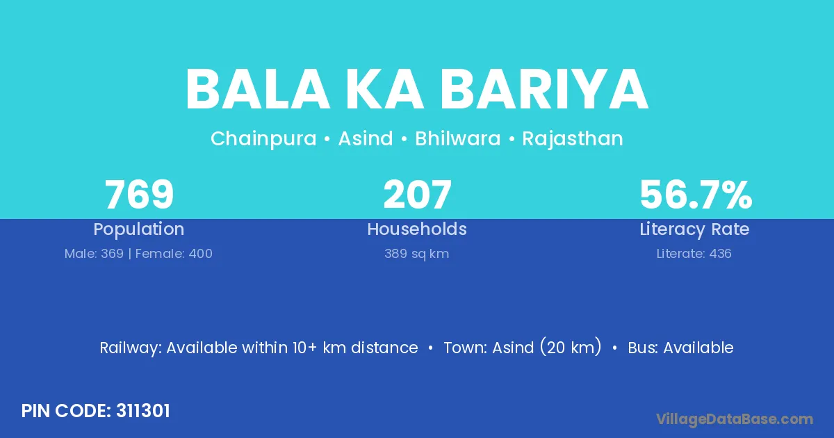 Asind (20 km) is the nearest town to Bala Ka Bariya village for major economic activities and is located approximately 20 km away.