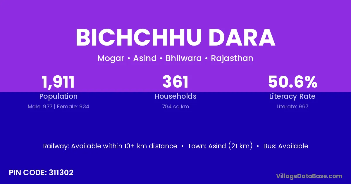 Asind (21 km) is the nearest town to Bichchhu Dara village for major economic activities and is located approximately 21 km away.