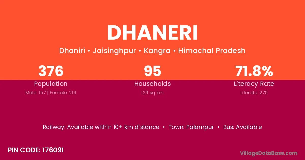 Dhaneri village has a total population of 638 people, of which 322 are males and 316 are females.