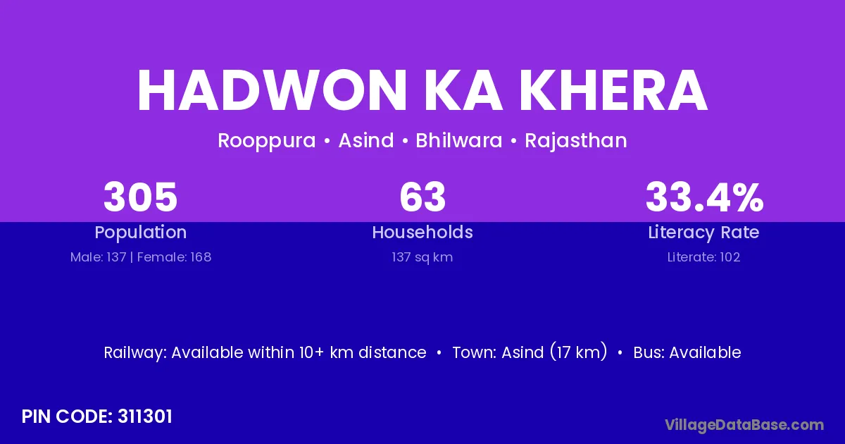 Asind (17 km) is the nearest town to Hadwon Ka Khera village for major economic activities and is located approximately 17 km away.