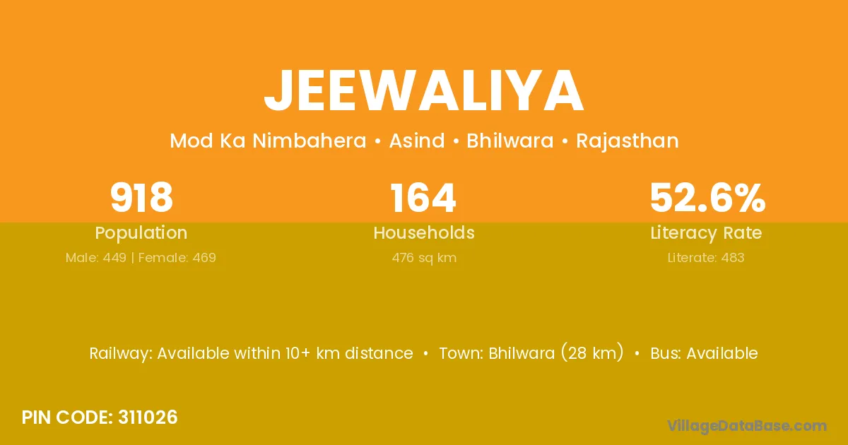 Bhilwara (28 km) is the nearest town to Jeewaliya village for major economic activities and is located approximately 28 km away.
