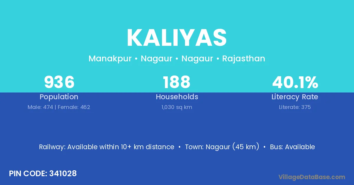 Asind (30 km) is the nearest town to Kaliyas village for major economic activities and is located approximately 30 km away.